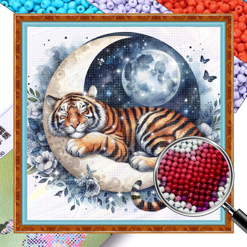 Tiger-Partial 11CT Stamped Cross Stitch Bead Embroidery 36*36cm/14.17*14.17in